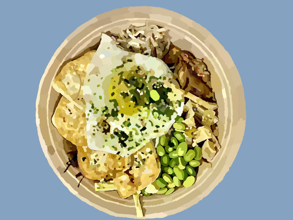 The mix-ins are the most exciting part. There are twenty options, and you can pick an unlimited number. I recommend getting no more than eight mix-ins, so you get a nice amount of each ingredient. My favorite combination of mix-ins so far has been cucumber, doraji, gosari, egg strips, eggplant, shiitake mushroom, kimchi, and edamame. The eggplant and mushroom are cooked to tender perfection. The edamame and cucumber add freshness to the warm bowl. The kimchi is quite spicy. I prefer not to add sriracha if I order kimchi as a mix-in. And let’s not forget about the doraji and gosari. These are roots used in traditional Korean food, and they add incredible texture and flavor to the bowl. My favorite is the gosari which is a darker brown color. It adds an earthy, subtly salty flavor. The gosari is soft, without being chewy, and has a wonderful, interesting texture that enhances the experience of the bowl. I can’t do it justice simply describing it. If you haven’t yet, you must try gosari for yourself. The doraji has a similar texture to a cooked carrot and a slightly bitter flavor. It adds another texture to the dish while the subtle bitterness gives a depth to the flavors.