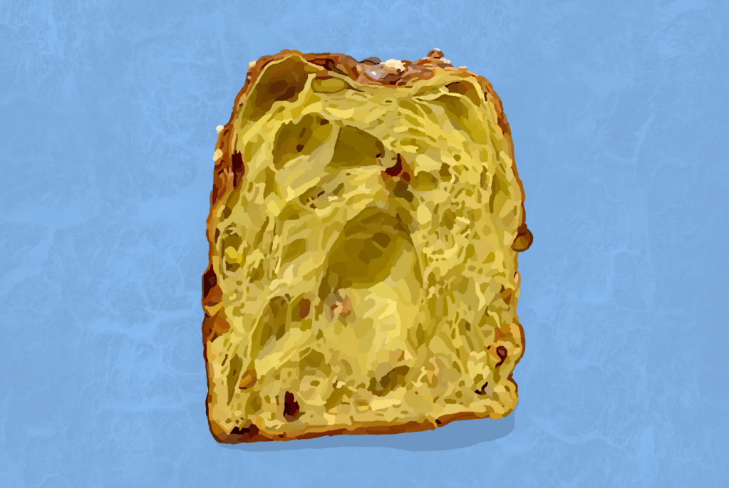 Pistachio Cherry Panettone – The Pistachio Cherry Panettone is a pistachio flavored panettone with whole pistachios and amarena cherries speckled throughout, topped with Italian pearl sugar. This panettone is a piece of culinary art. As I cut each slice, the knife simply glides through the impeccable bread. It has the gorgeous, airy holes inside that are a sign of incredible panettone made from beautiful sourdough. It is so buttery and soft it melts in your mouth. The nutty, sweet and savory pistachio flavor comes through while letting the unique panettone flavor shine through. There is the perfect amount of pistachios and cherries so that you get some in every bite. The pistachios add pure pistachio flavor and a crunch. The cherries are juicy and soft with a delectable sweet, tart flavor that cuts through the rich, sweet bread. The Italian pearl sugar on top adds a fun, crisp texture and a clean, pleasant sweetness. Each component comes together to create a divine harmony of flavor and texture. Roy Shvartzapel has truly mastered the art of making panettone, an incredibly difficult confection to bake. It does not get better than this. Each bite is a taste of true perfection.