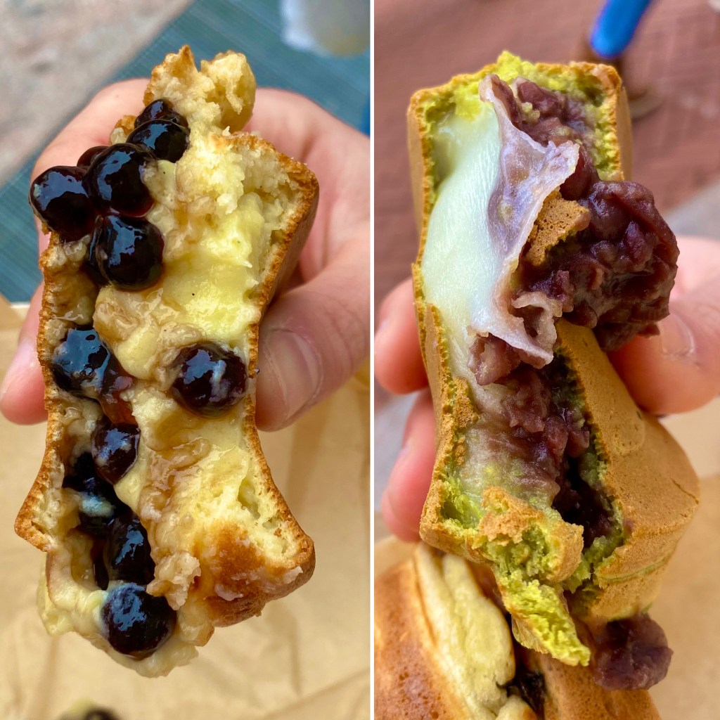 Catmint Wheel Cake – The wheel cakes, also known as imagawayaki, were by far my favorite treat I tried. Wheel cakes are made with a fluffy, pancake like batter in a special “grill” with circular shaped idents. The outside of the cake is cooked to become golden and crispy on the outside, and the filling inside is gooey and warm. I had three flavors: a plain cake with custard and boba inside, a matcha cake with mochi and red bean inside, and an ube cake with ube and custard inside. The boba filled cake is light and tender with the warm, rich custard in the center. The boba adds a satisfying chew and the deep caramelized brown sugar syrup melds into the rich vanilla custard. If you are a boba fan, this is the flavor for you. The matcha and red bean cake has an excellent earthy flavor. The smooth, sweet, nutty red bean compliments the earthy matcha cake, and the warm mochi is ultra gooey and delicious. The mochi adds a subtle rice flavor that blends nicely with the red bean and balances out its stronger flavor. The ube cake is filled with real pureed ube with the most delicious sweet potato flavor. It blends with the gorgeous cream making the perfect harmony of vanilla cream and earthy, nutty sweet potato. This is my favorite ube dessert I’ve ever had because of the real pure ube inside as well as the incredible cake and custard. These wheel cakes are one of the most delicious desserts I’ve ever had! You absolutely must try them!