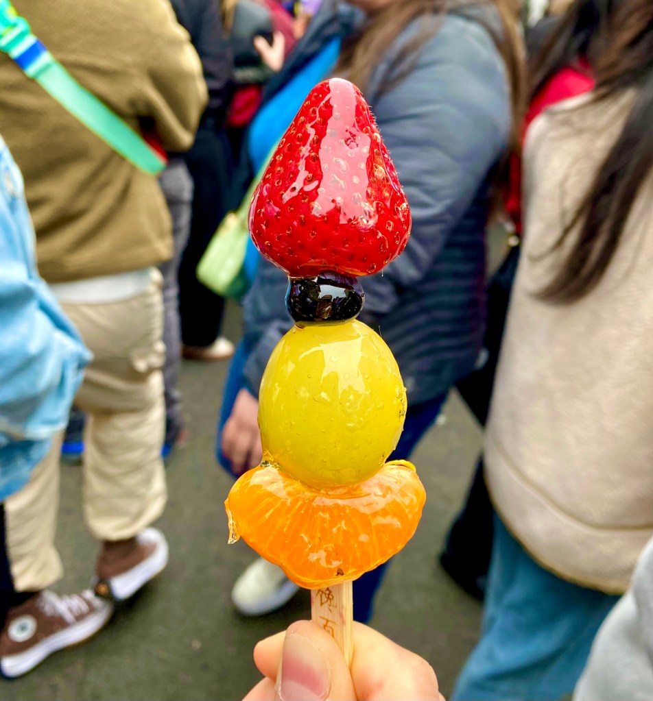 HGG Tang Hulu – Tanghulu is a traditional Chinese treat that is also popular in Japan. It is made of skewered fruit with a crisp sugar coating. This stand offers a variety of fruits including grapes, hawthorne, strawberries, clementines, blueberries, and more. I got the mini tanghulu with a medley of fruit. All the fruit is incredibly sweet and juicy. The crispy sugar lends the tanghulu a dessert-like sweetness that is balanced out by the bright, fresh fruit. My favorite part was the muscat grape. Muscat grapes are extra large and are some of the sweetest, most refreshing and juicy grapes you will ever have. They also have an amazing firm flesh and crisp skin. I will certainly be getting the grape tanghulu next time! Whatever fruit you choose, you can’t go wrong with this delicious treat!